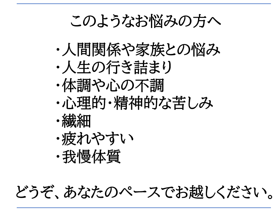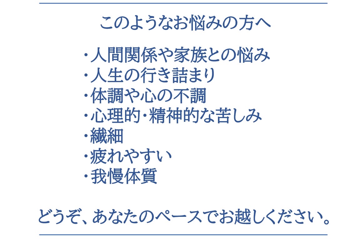 本来のあなたへ戻るために、心と身体が整い、健やかに、そして心軽やかに過ごせるようそっと寄り添い、サポートしてまいります。あなたが自分に戻る"その道のりを共に歩む、